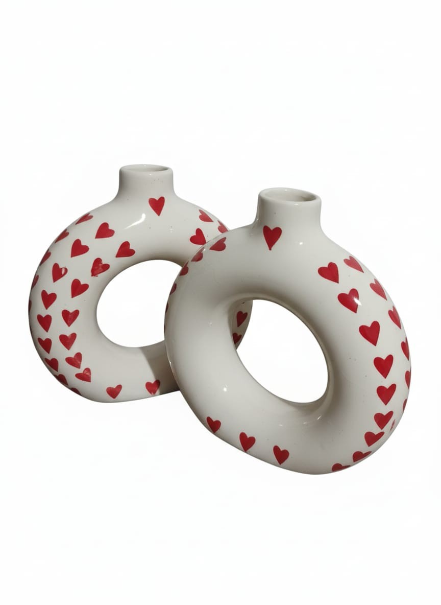 This charming set includes two identical ceramic vases, each featuring a unique donut-shaped design with a hollow center. They are crafted from glossy white ceramic and adorned with a playful pattern of small red hearts. These vases are perfect for displaying small bouquets, dried flowers, or pampas grass, adding a touch of romance and modern flair to any shelf, table, or mantelpiece. Their distinct shape and loving design make them a lovely accent for Valentine's Day or everyday decor.