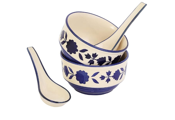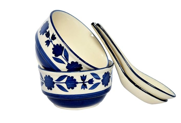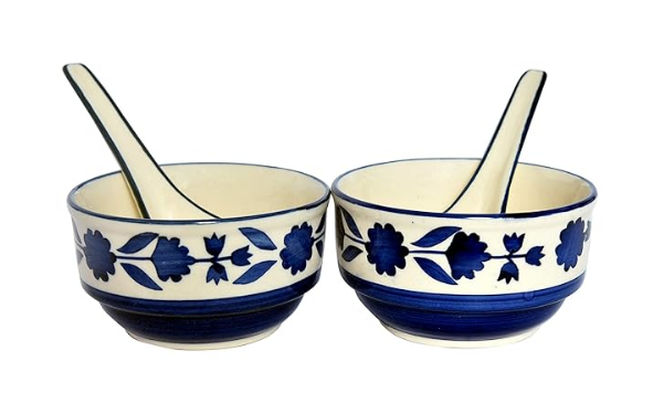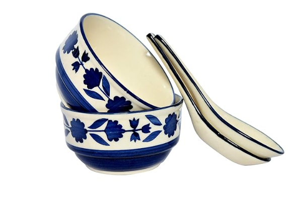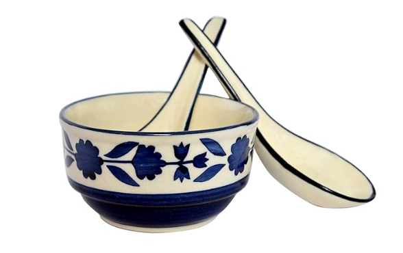 Ceramic Handcrafted Stoneware Royal Blue Soup Bowl/Serving Bowl(4" Diameter) with Soup Spoon-Set of 1 (bowl + spoon )(250ml, Microwave & Dishwasher Safe,Soup Bowl Set for Kitchen